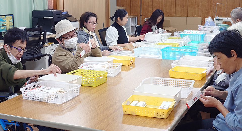 生産活動としては、のぼりたたみ、箸入れ、カップやマドラースプーンの梱包などの軽作業を毎日行っています。達成感を味わい自信に繋がっていくような支援をしています。